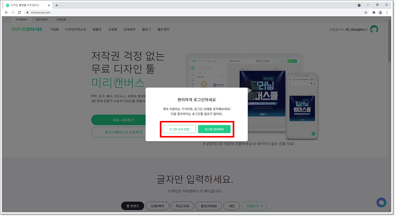 미리캔버스에 접속하는 PC 환경에 따라 로그인 유지 여부 중 하나를 선택합니다. 여럿이 사용하는 공용 컴퓨터의 경우 [로그인 유지 안함]을 선택하는 것이 좋습니다.