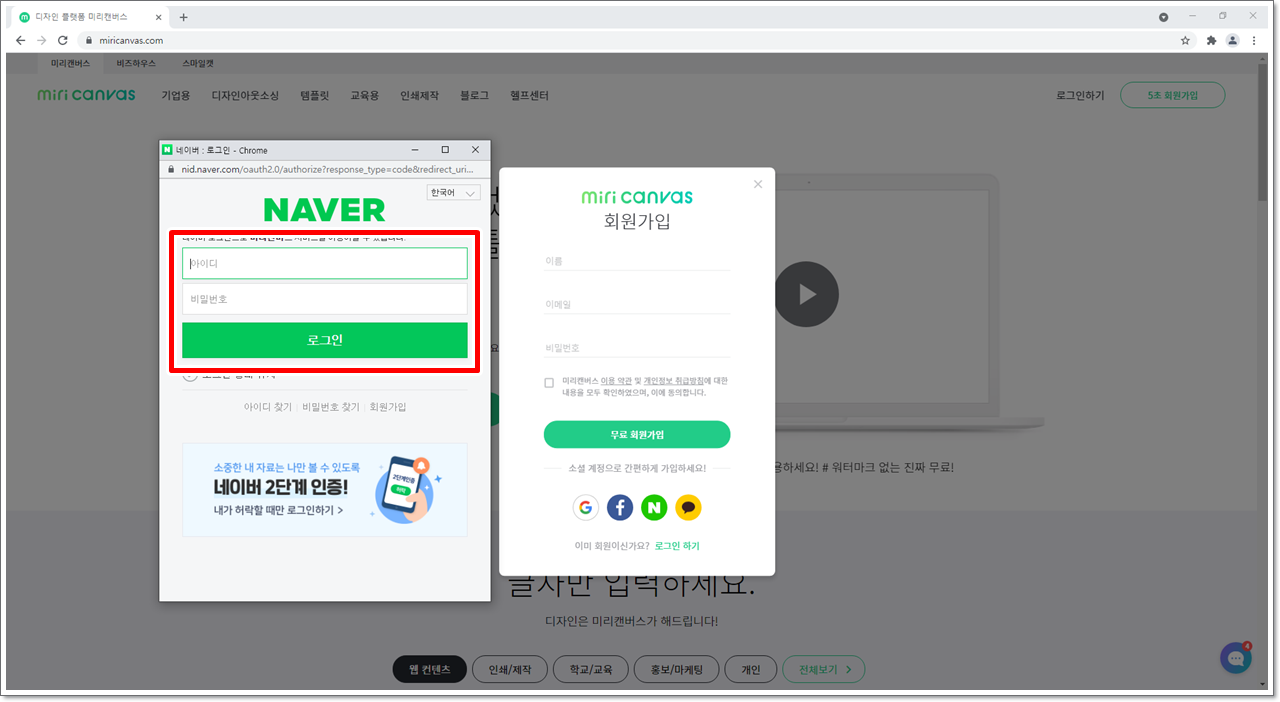 미리캔버스 회원 가입은 아래와 같은 방법 중 간편한 방법을 선택하면 됩니다.