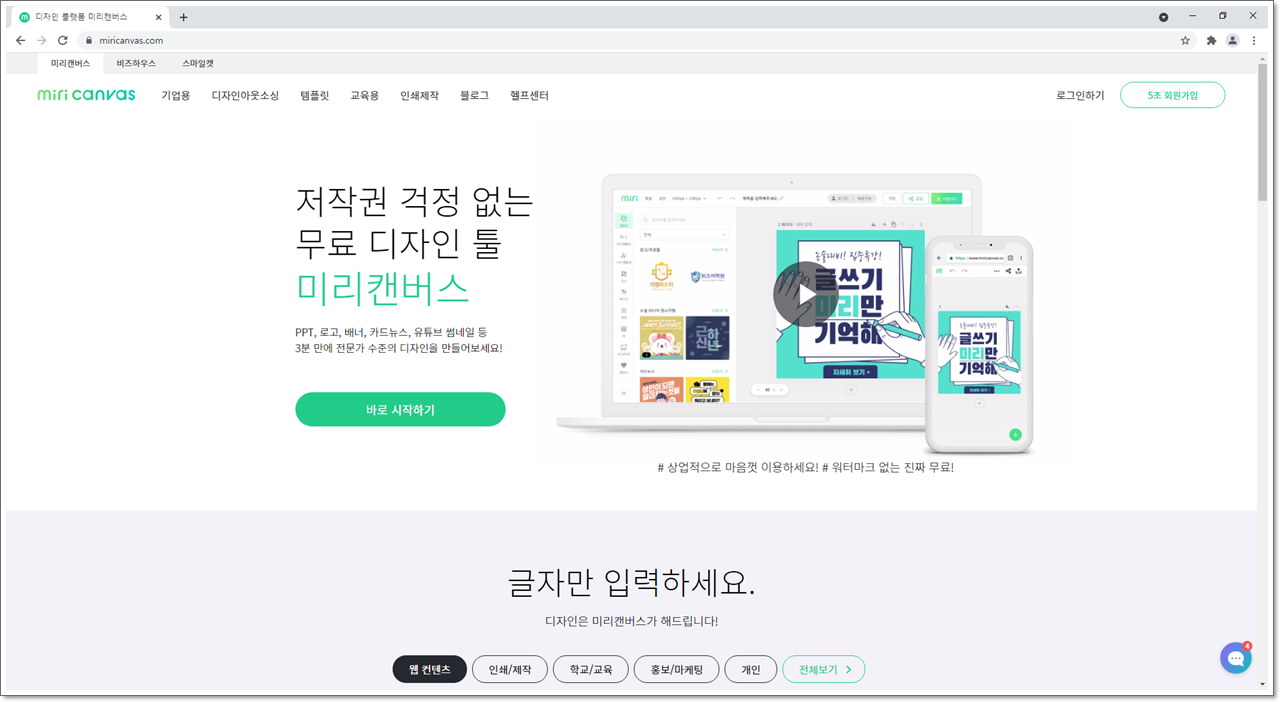 다양한 디자인 템플릿을 편집하고 수정할 수 있는 미리캔버스 사이트에 접속합니다. (https://www.miricanvas.com/)