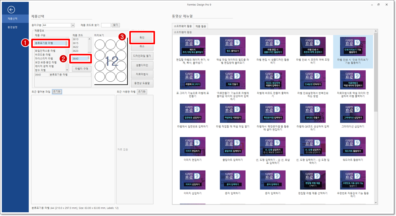 4. [분류표기용 라벨] - [3640] - [확인]을 클릭합니다.