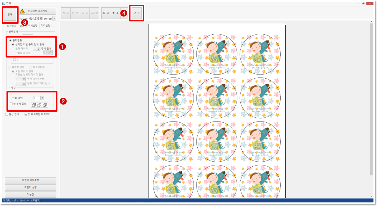용지단위에서 인쇄 매수를 지정하고 [인쇄]를 클릭합니다. [칼선 인쇄]는 원형으로 잘라진 라벨지가 없을 경우 일반 라벨지를 이용해 칼선(원형테두리가 같이 인쇄됨)을 인쇄하는 메뉴입니다. 출력 후 가위 등을 이용해 칼선을 따라 오려서 사용하면 됩니다. 그러나 급할 경우에만 사용하는 것을 권장합니다. 라벨의 크기가 작거나 오릴 라벨의 개수가 많은 경우, 생각보다 시간도 많이 걸리고 동그랗게 잘 오려지지 않습니다. 인쇄가 끝나면 [닫기]를 클릭합니다.