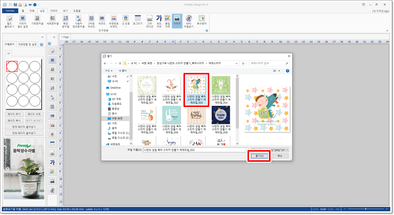 [열기] 대화 상자가 나타나면 미리 다운로드받아 압축을 해제한 예제 파일 중 [나만의 생일축하카드 만들기 예제파일_003]을 선택하고 [열기]를 클릭합니다.