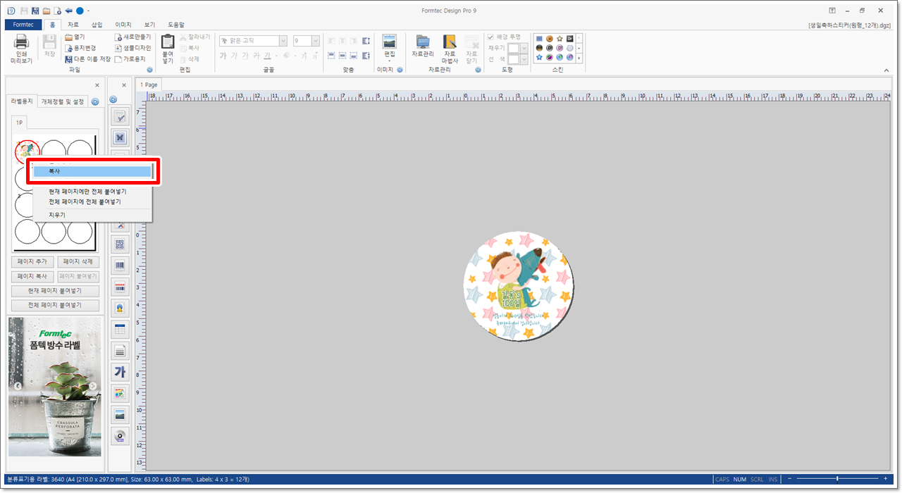 왼쪽 라벨용지 미리보기 부분에서 작업 중인 라벨 디자인 파일로 마우스 포인터를 옮깁니다. 마우스 오른쪽 단추를 클릭하면 나오는 바로가기 메뉴 중에서 [복사]를 클릭합니다.