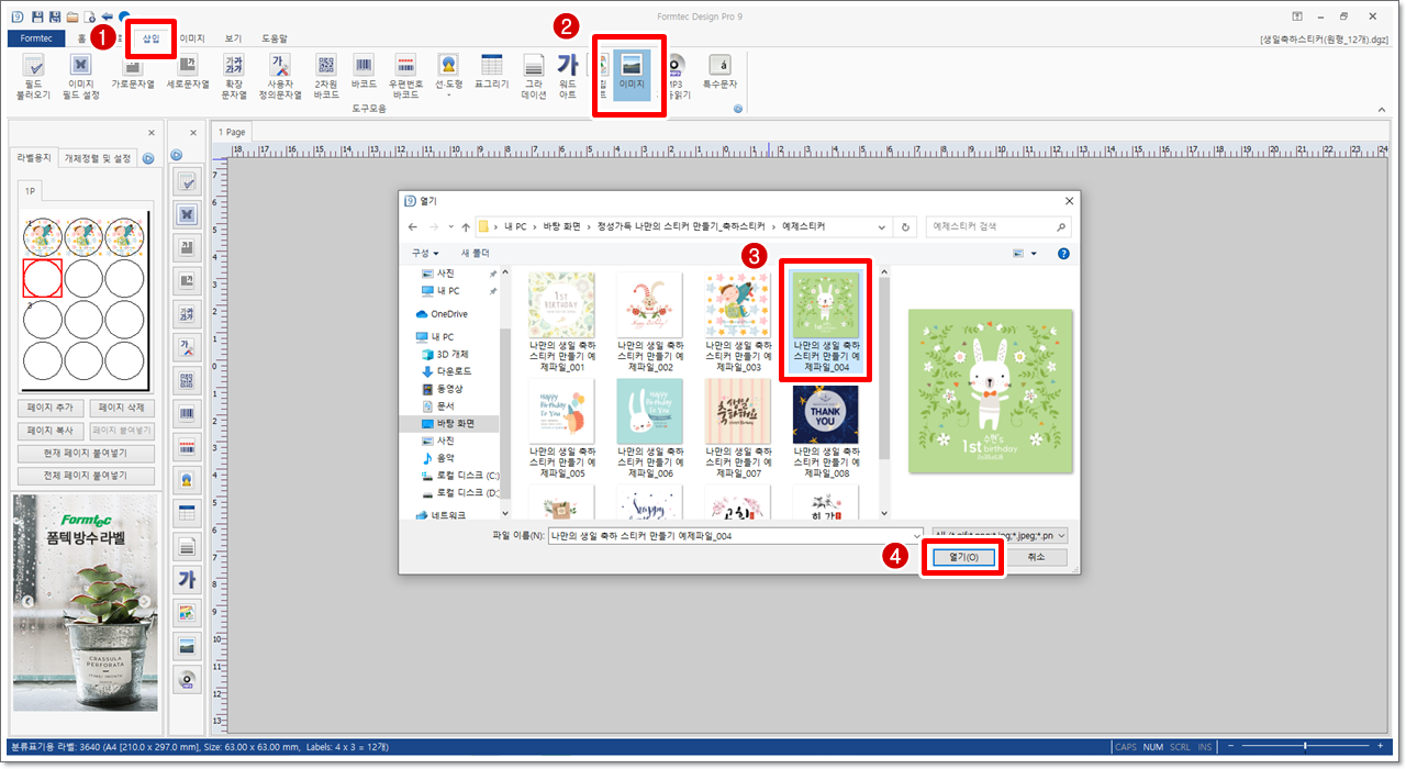 [삽입] 탭에서 [이미지]를 클릭합니다. [열기] 대화 상자가 나타나면 미리 다운로드받아 압축을 해제한 예제 파일 중 [나만의 생일축하카드 만들기 예제파일_004]를 선택하고 [열기]를 클릭합니다.