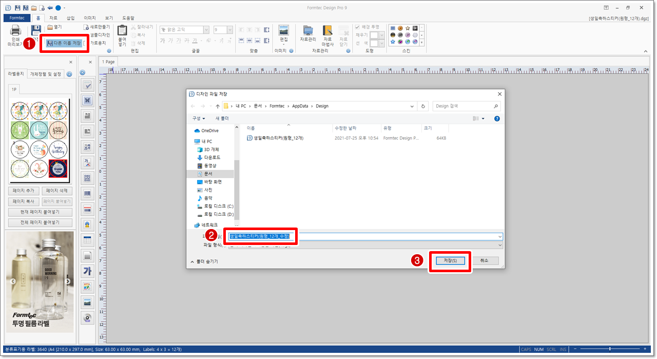 [홈] 탭에서 [다른 이름 저장]을 클릭합니다. [디자인 파일 저장] 대화 상자가 나타나면 앞에서 작업했던 디자인 파일의 이름과 다르게 파일 이름을 입력하고 [저장]을 클릭합니다. 일반적으로 작업한 디자인 파일은 [내 PC] - [문서] - [Fromtec] - [AppData] - [Design] 폴더에 저장됩니다.