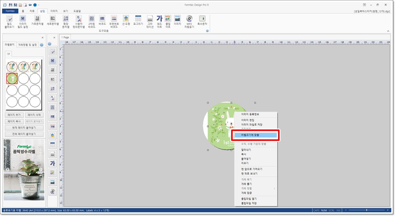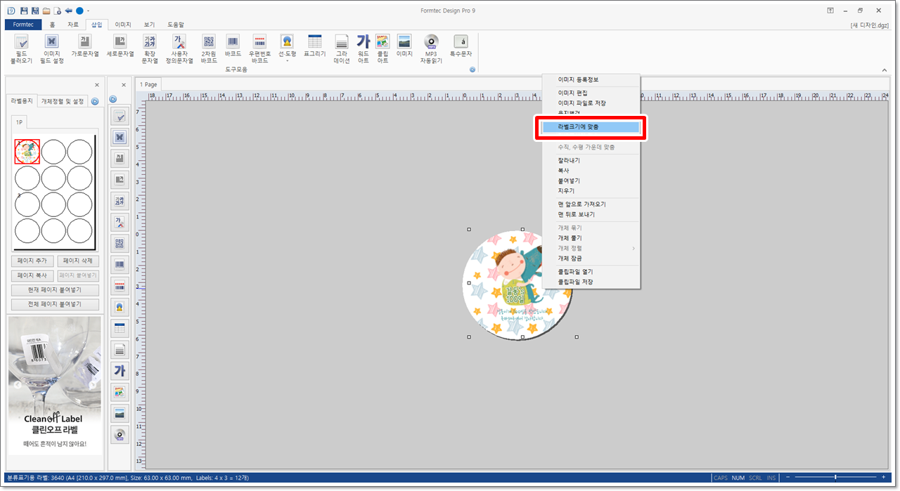 삽입된 이미지 위에서 마우스 오른쪽 단추를 누르면 나오는 바로가기 메뉴 중에서 [라벨 크기에 맞춤]을 클릭합니다. 이경우 이미지를 드래그하여 크기를 조절하거나 위치를 조절하지 않고 편리하게 라벨 크기에 맞게 설정할 수 있습니다.