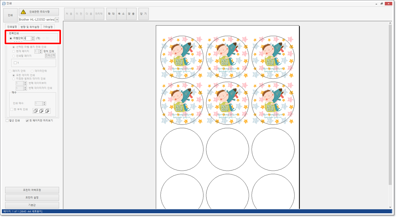 라벨 단위는 지정한 수만큼 라벨지에 출력하는 메뉴입니다. 필요한 생일축하스티커의 개수만큼 입력하면 됩니다. 사용하고 남은 라벨은 다시 사용할 수 있습니다(6개까지 사용한 라벨은 나중에 인쇄 메뉴에서 7번 라벨부터 출력하도록 지정할 수 있습니다).