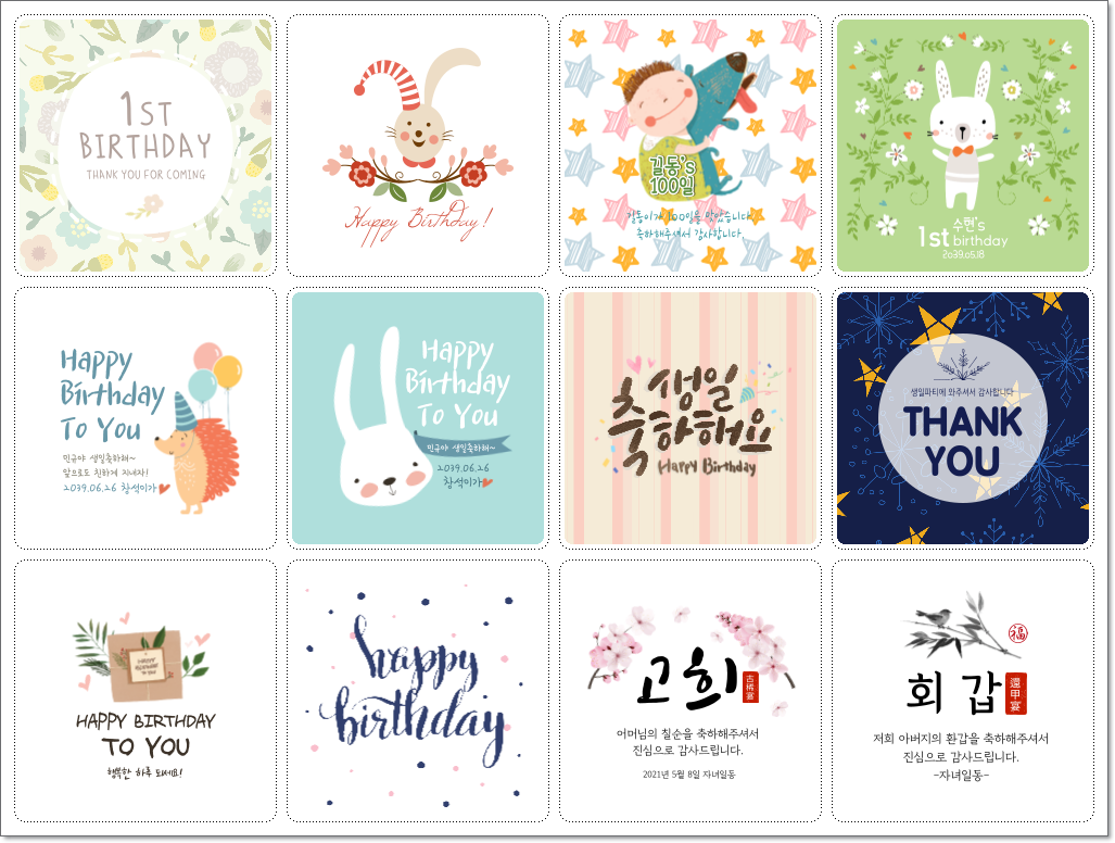 미리캔버스에서 다양한 템플릿으로 디자인한 생일 축하 스티커를 이미지 파일로 저장해두면 문서 작성 등에 다양하게 활용할 수 있습니다. 그 중에서 가장 활용도가 높은 것은 라벨지에 출력해 사용하는 것입니다. 라벨지의 장점은 칼질을 하지 않고 다양한 모양으로 출력하고 다양한 곳에 붙일 수 있는 것입니다.