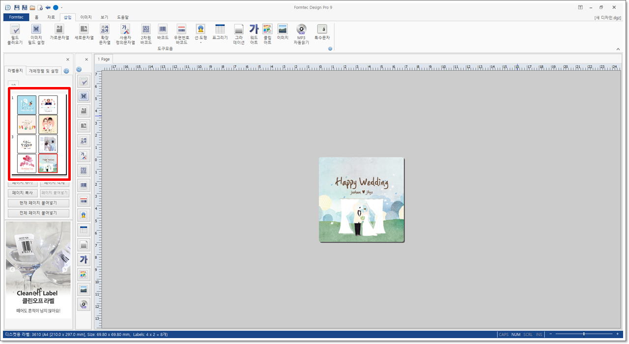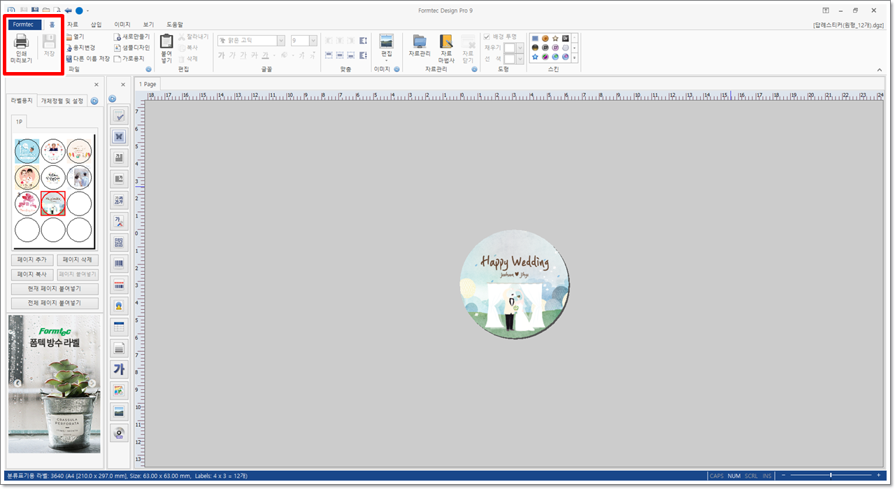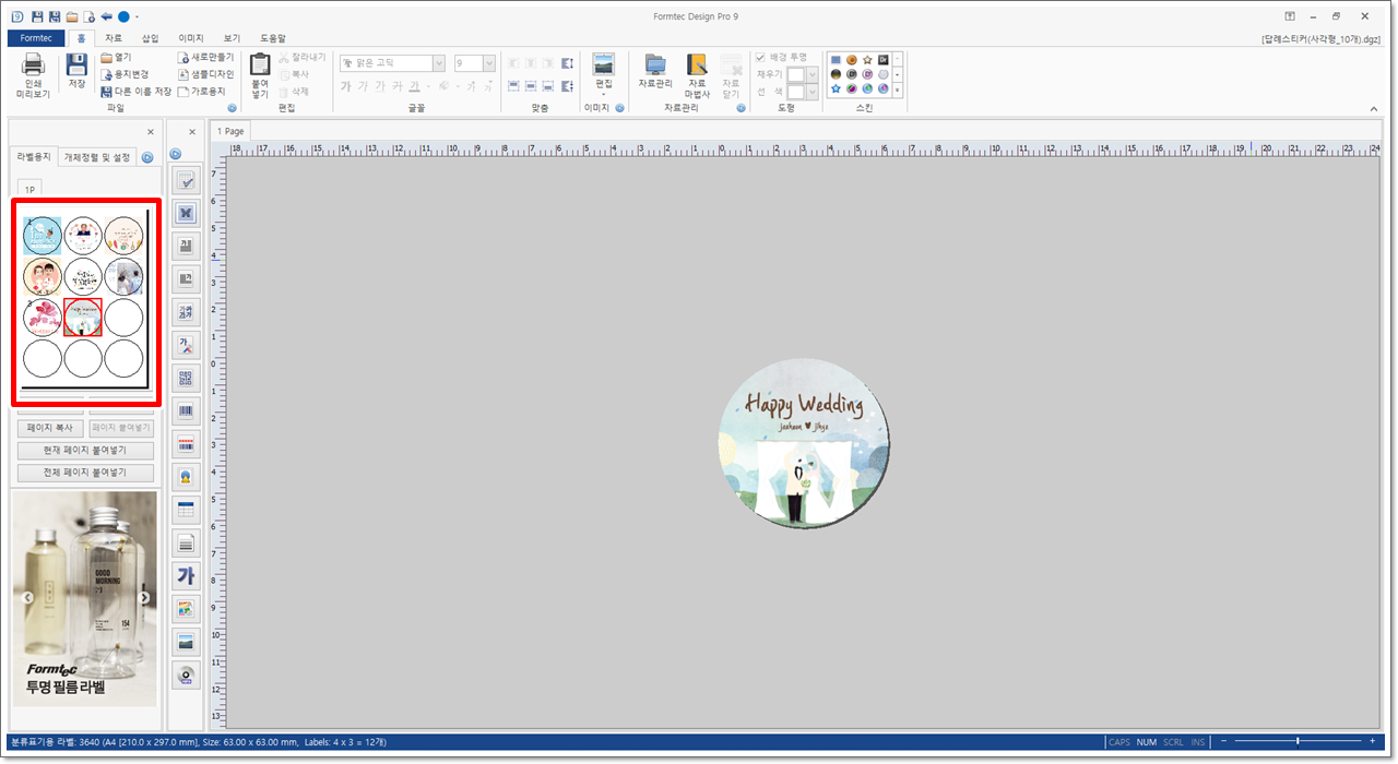 미리캔버스에서 디자인한 결혼이나 생일 답례 스티커를 이미지 파일로 저장해두면 문서 작성 등에 다양하게 활용할 수 있습니다. 그 중에서 가장 활용도가 높은 것은 라벨지에 출력해 사용하는 것입니다. 먼저 폼텍 디자인 프로를 이용해 스티커를 라벨지에 출력할 수 있도록 작업하고 저장합니다. 나중에 [용지 변경] 메뉴를 이용해 쉽게 다른 모양의 라벨지로 수정하여 출력 가능합니다.