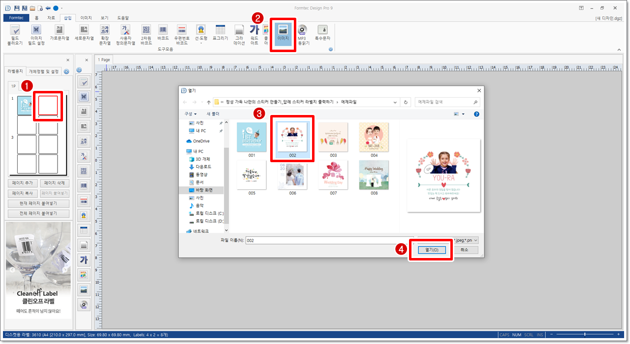 [라벨용지] 탭에서 2번째 라벨을 선택합니다. 이어 [삽입] - [이미지] - [예제 파일] - [열기]를 클릭합니다.