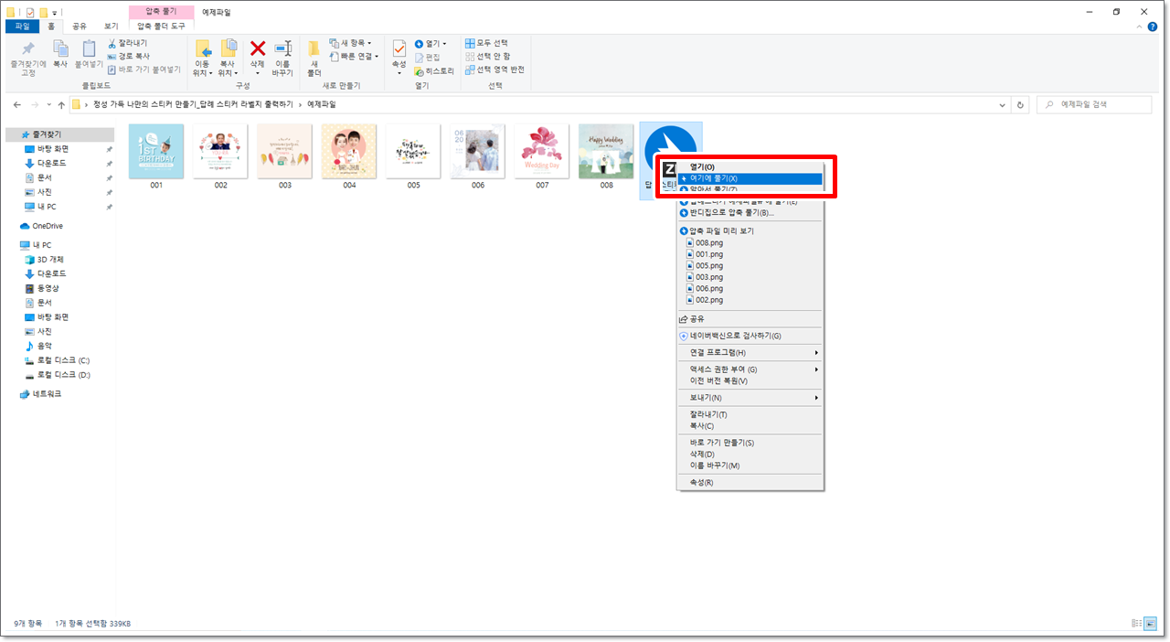 아래 예제 파일을 클릭하면 자동으로 다운로드가 시작됩니다. 일반적으로 [내 PC] - [다운로드] 폴더에 저장됩니다. 내려받은 파일을 선택한 다음 [열기]를 클릭합니다. 또는 [내 PC] - [다운로드] 폴더와 같이 내려받은 예제 파일이 들어 있는 폴더를 엽니다. 이어 예제 파일을 선택한 다음 [여기에 풀기]를 클릭하면 압축을 해제합니다(반디집 기준). 아래 압축 파일은 암호가 걸려있습니다. 암호가 필요하신 분은 댓글을 남겨주세요.