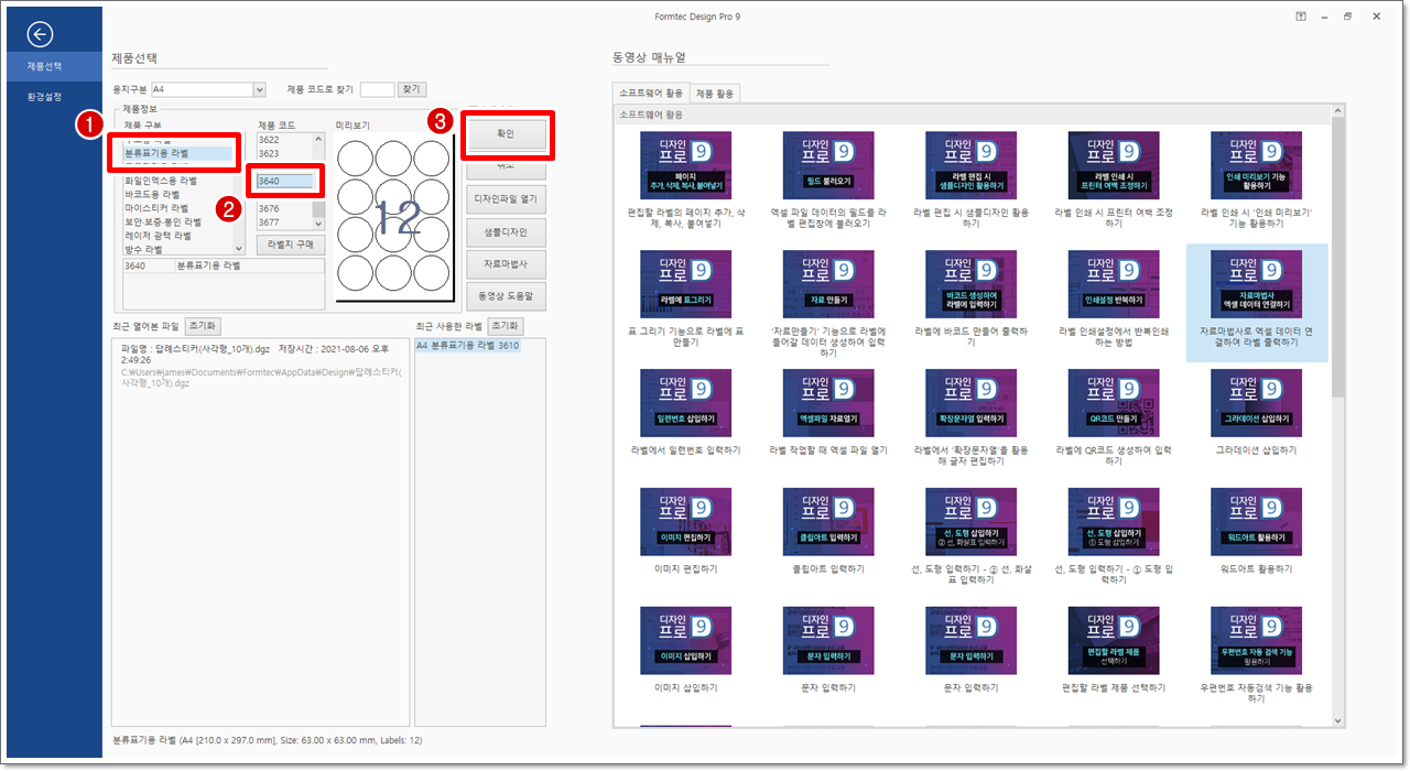 3. 폼텍 디자인 프로 9를 실행시킨 다음, [분류표기용 라벨] - [3610] - [확인]을 클릭합니다.