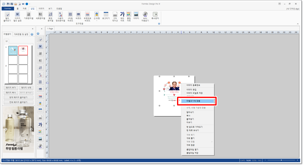 삽입된 이미지 위에서 마우스 오른쪽 단추를 누르면 나오는 바로가기 메뉴 중에서 [라벨 크기에 맞춤]을 클릭합니다. 이경우 이미지를 드래그하여 크기를 조절하거나 위치를 조절하지 않고 편리하게 라벨 크기에 맞게 설정할 수 있습니다.