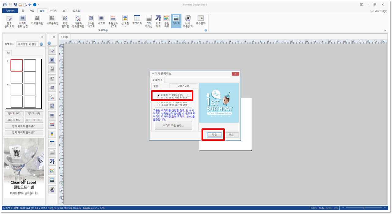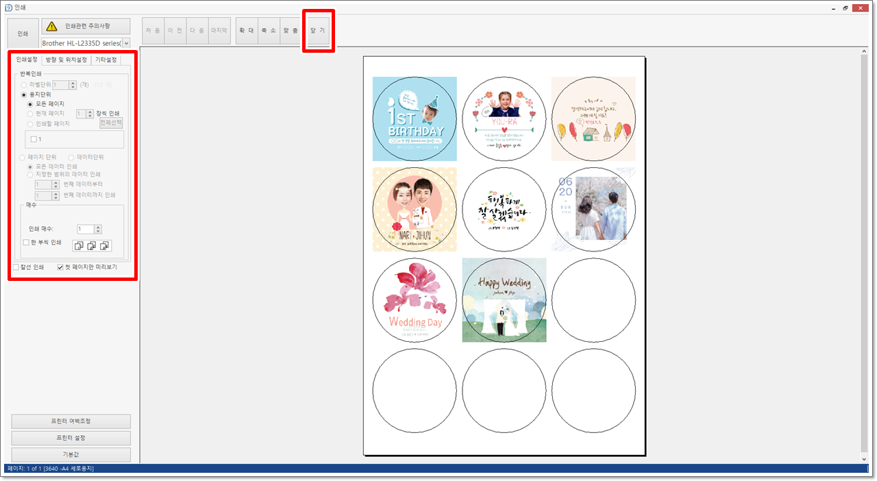 같은 방법으로 나머지 답례 스티커 이미지의 크기도 [라벨 크기에 맞춤]으로 설정합니다.