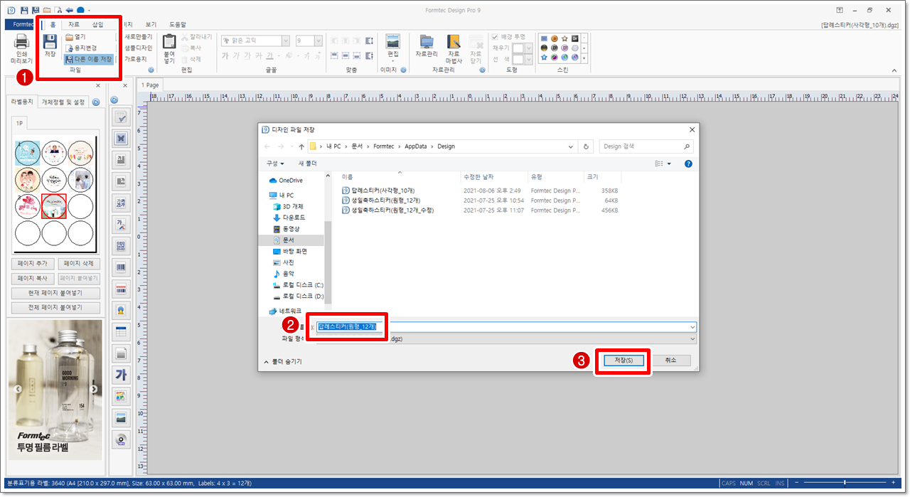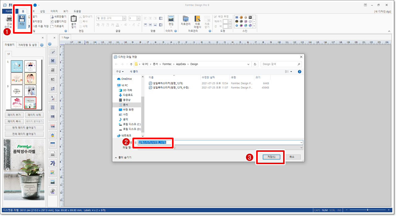 [홈] 탭에서 [저장]을 클릭합니다. [디자인 파일 저장] 대화 상자가 나타나면 파일 이름을 입력하고 [저장]을 클릭합니다. 일반적으로 작업한 디자인 파일은 [내 PC] - [문서] - [Formtec] - [AppData] - [Design] 폴더에 저장됩니다.