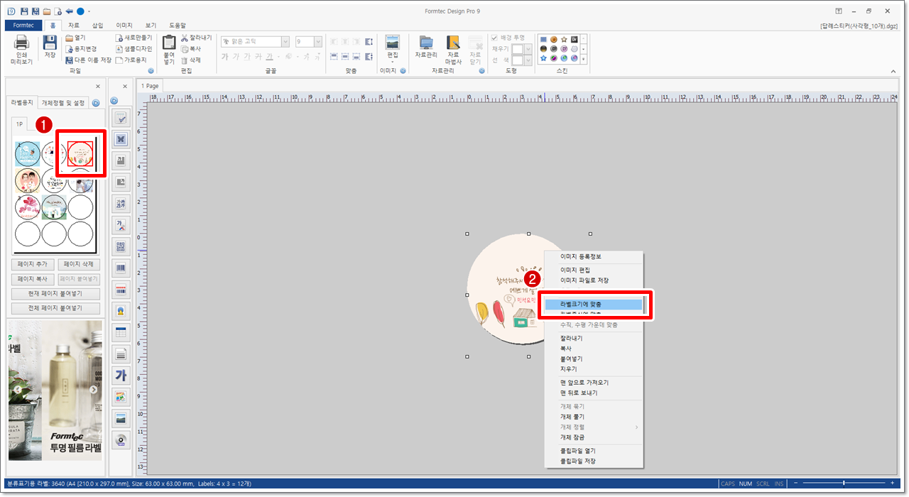 8칸 사각형에서 12칸 원형으로 용지가 바뀌어 삽입된 답례 스티커의 이미지 크기가 맞지 않을 수 있습니다. 삽입된 답례 스티거 이미지 위에서 마우스 오른쪽 단추를 누르면 나오는 바로가기 메뉴 중에서 [라벨 크기에 맞춤]을 클릭합니다.