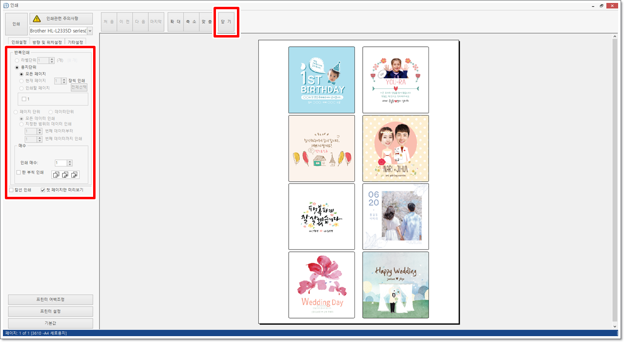 용지 단위는 인쇄 매수를 지정한 만큼 출력해주는 메뉴입니다. 1매일 경우 8개의 라벨을 출력해줍니다. 인쇄가 끝나면 [닫기]를 클릭합니다.