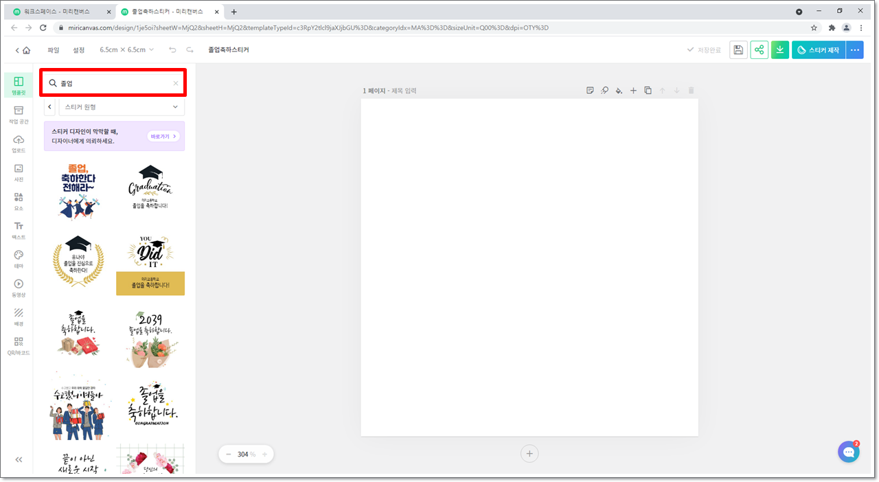 검색한 졸업 축하 스티커 디자인 중에 마음에 드는 디자인을 클릭하면 자동으로 빈 페이지에 적용됩니다. 현재 페이지 하단 중간에 새 페이지 추가(+)를 클릭하면 빈 페이지가 추가됩니다.