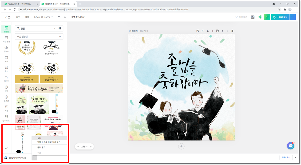 내려받은 졸업 축하 스티커 디자인 파일(압축파일)을 선택한 다음 [열기]를 클릭합니다. 연결된 압축프로그램을 이용해 적당한 폴더에 디자인 파일의 압축을 풉니다.