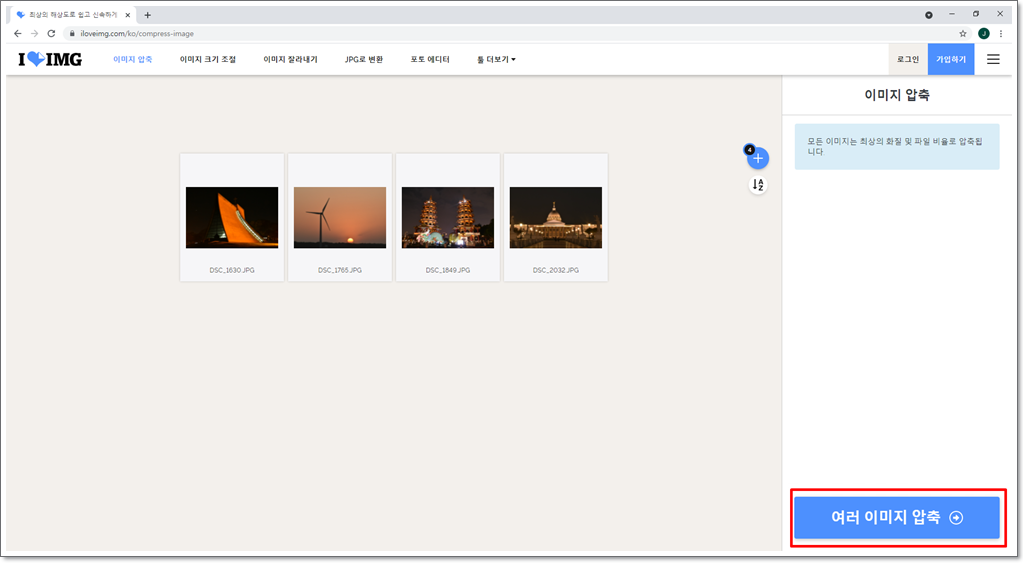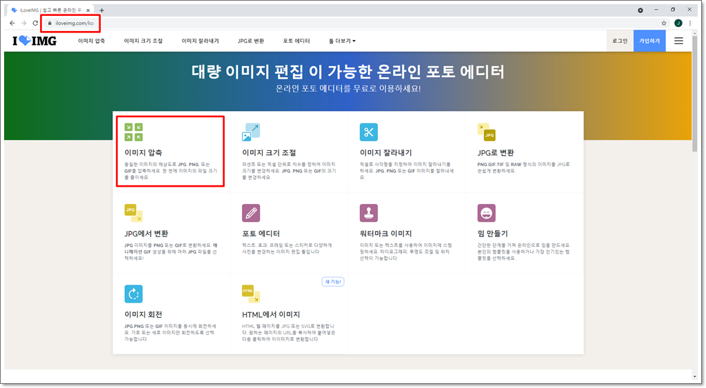 1. iloveimg 사이트(https://www.iloveimg.com/ko)에 접속한 다음, [이미지 압축]을 클릭합니다.