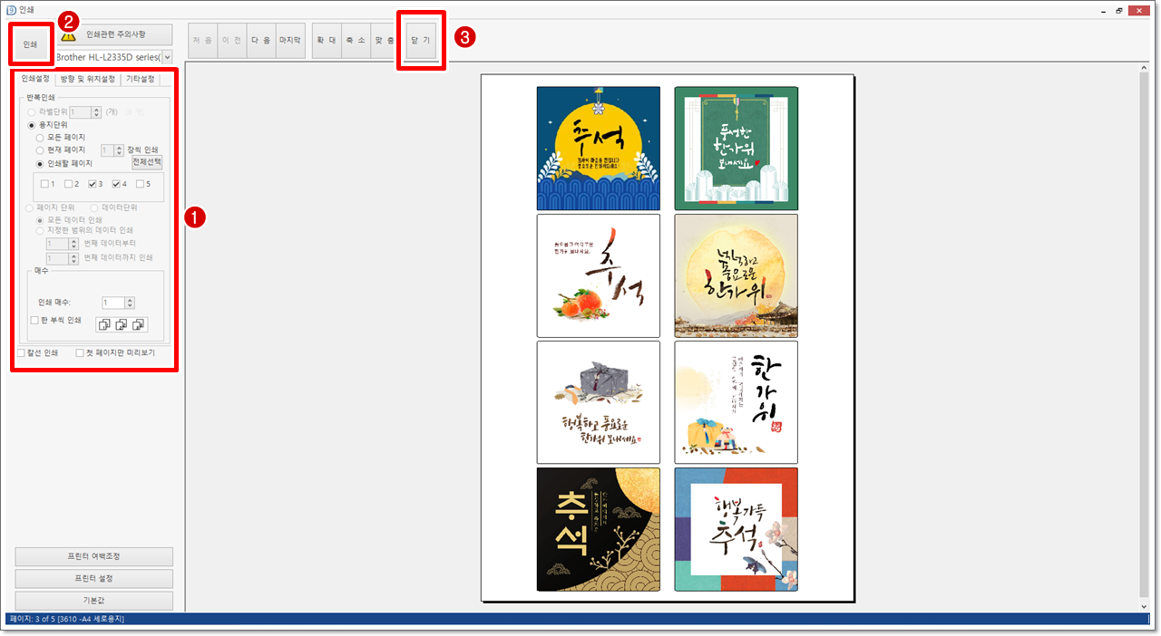 여러 개의 이미지로 여러 페이지의 라벨을 디자인한 다음, 인쇄 메뉴에서 [용지단위] - [인쇄할 페이지 지정] 3, 4페이지 각각 1매로 지정하고 출력한 경우