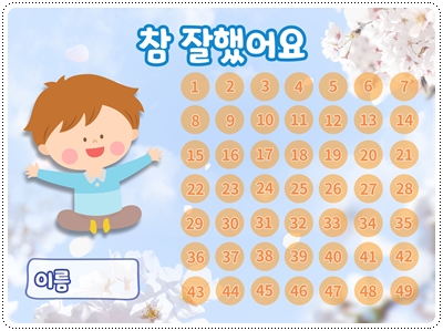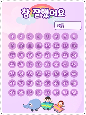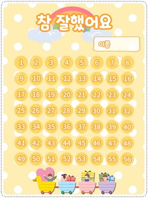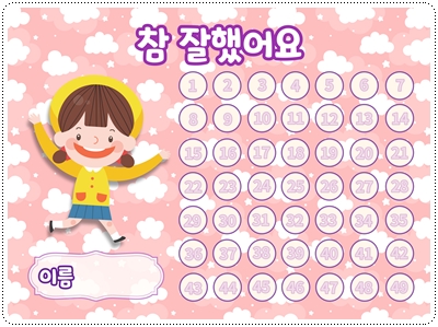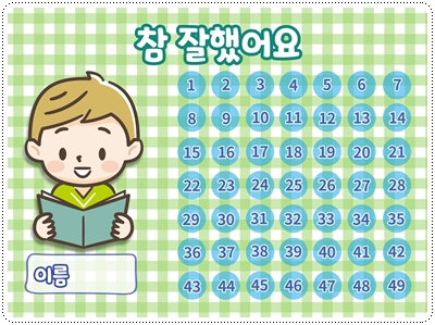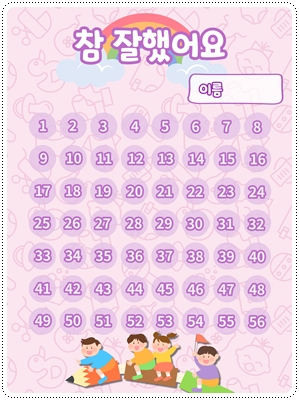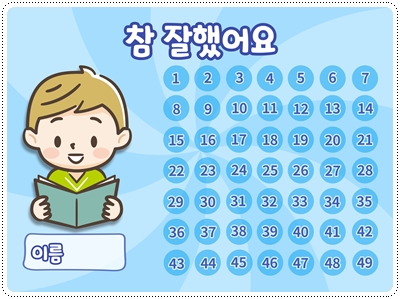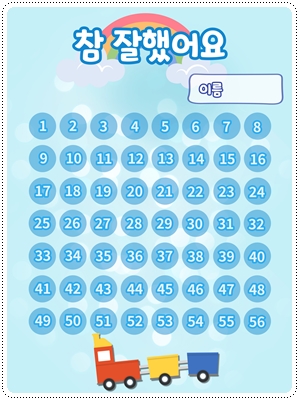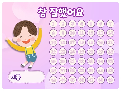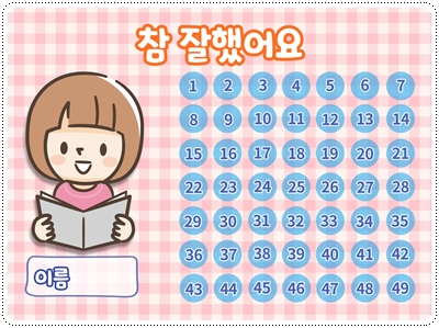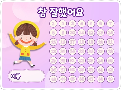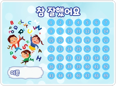 칭찬스티커판(한글 버전)입니다. 가정이나 어린이집, 유치원, 학교에서 칭찬스티커 모음판, 독서스티커 모음판 등 다양한 용도로 사용할 수 있습니다. A4 사이즈에 맞게 디자인되어 있습니다. 그대로 출력해서 사용하시면 됩니다.