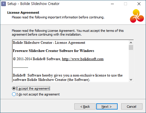 라이센스 동의 화면에서 [I accept the agreement]를 선택하고 [Next]를 클릭합니다.