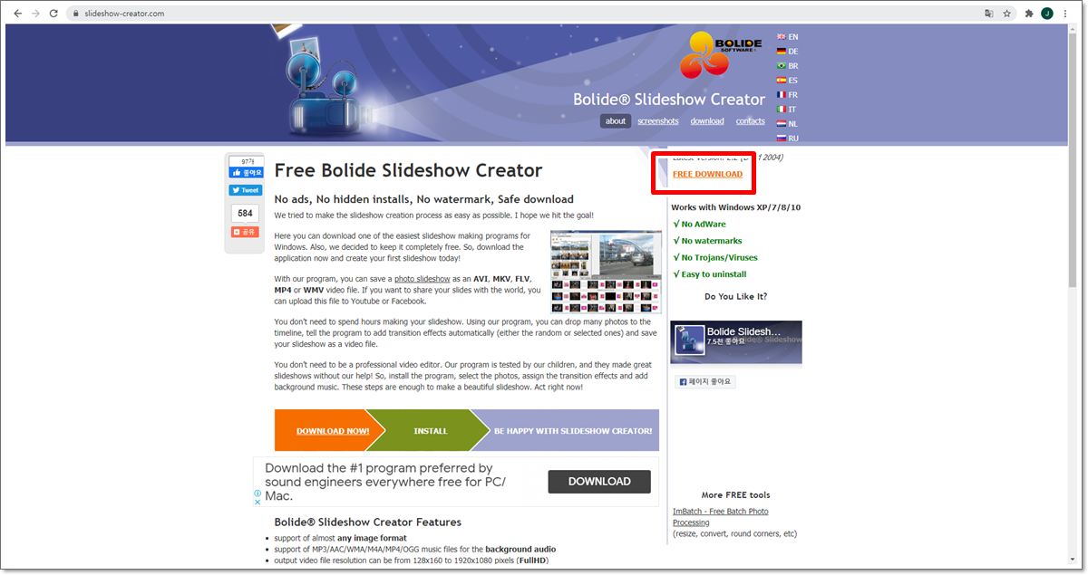 Bolide Slideshow creator(https://slideshow-creator.com/) 사이트에 접속합니다. [FREE DOWNLOAD]를 클릭해 설치 파일을 다운로드 폴더에 저장합니다.