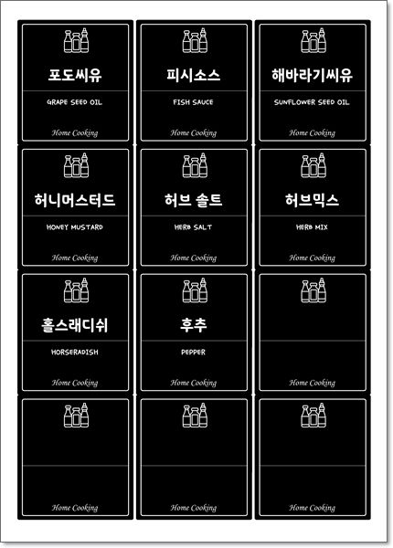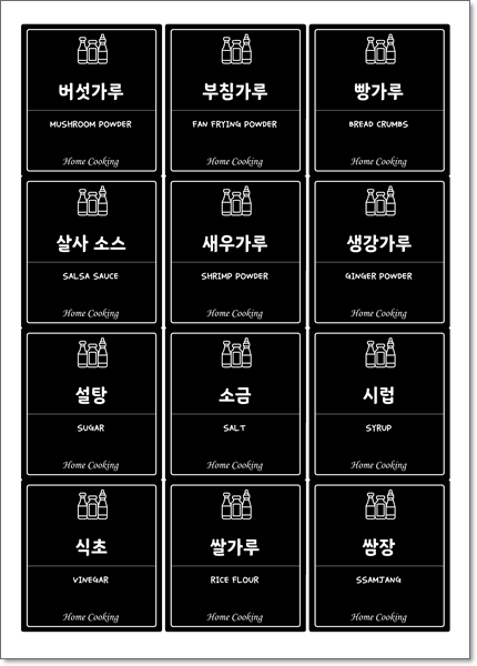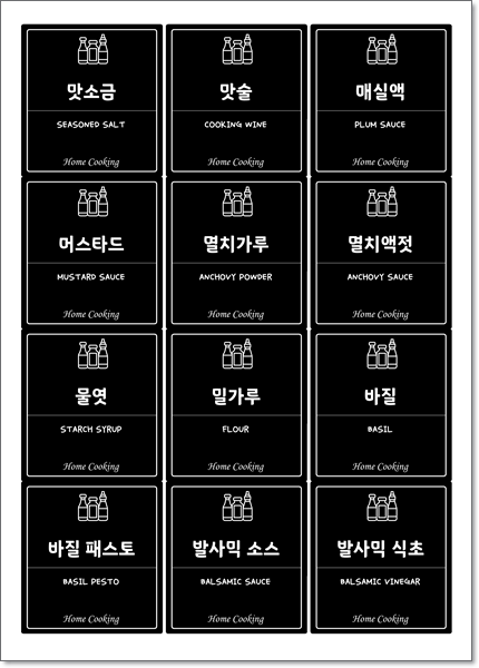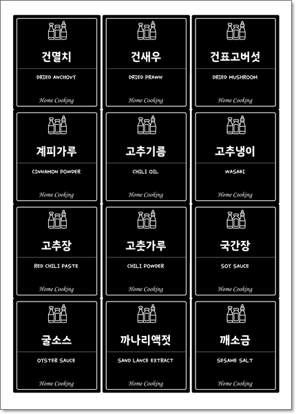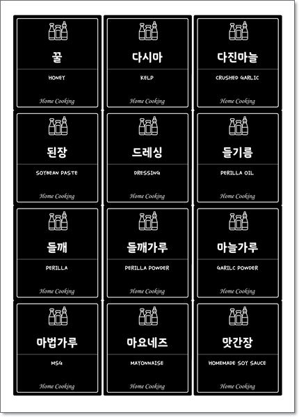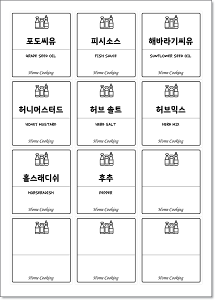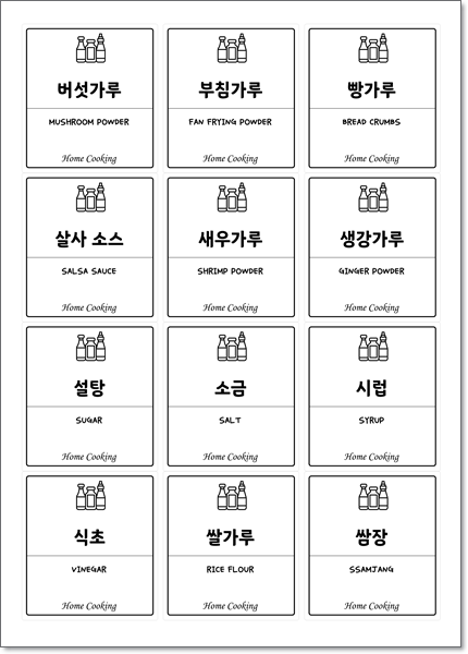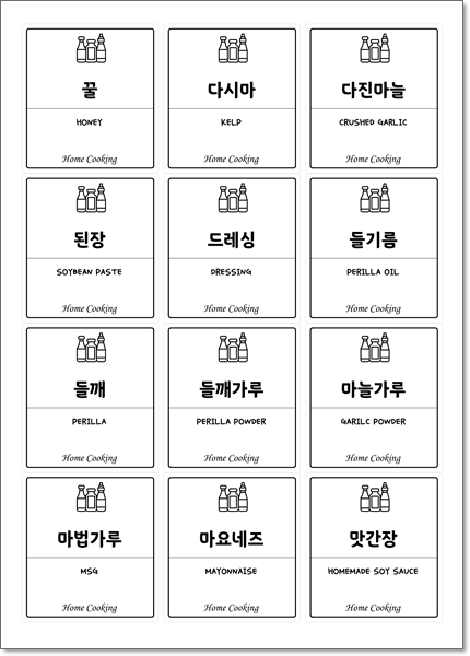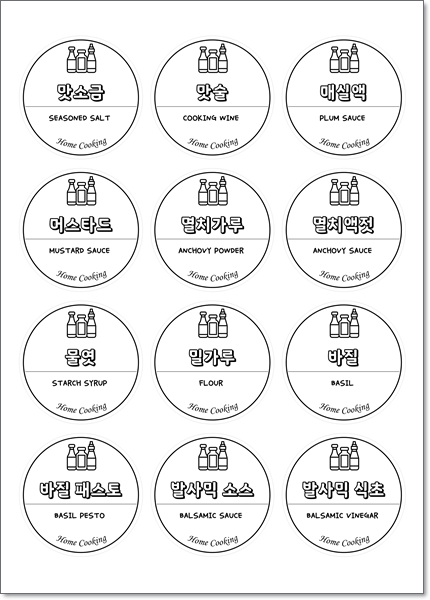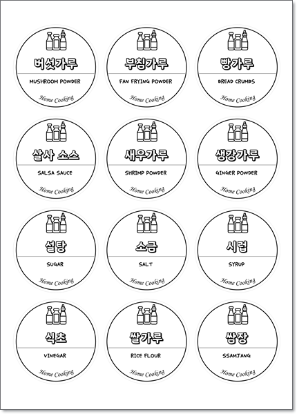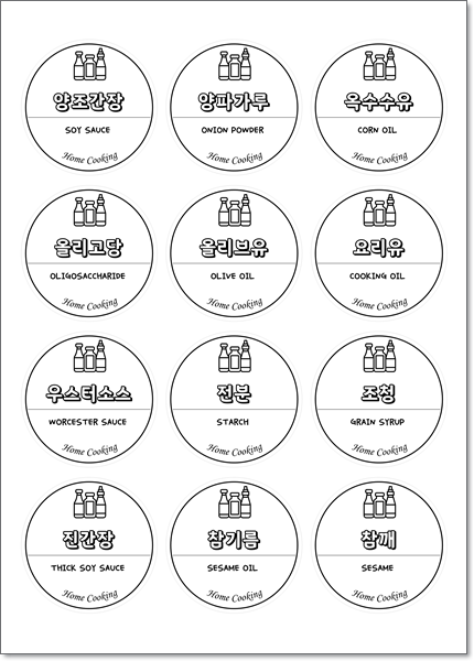 양념통 스티커 라벨 도안을 이용해 다양한 양념과 소스들을 손쉽게 구분하고 정리해보세요. 제공되는 파일을 그대로 라벨지에 출력해서 사용하시면 됩니다.