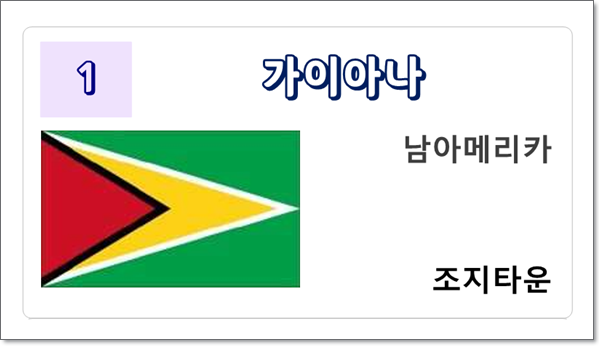 세계 여러 나라의 국기와 수도를 놀이를 통해 배울 수 있도록 카드 형식으로 만들었습니다. A4용지(180g)에 인쇄하고 자른 다음, 뒷면에 국기를 붙여 다양한 방법으로 놀이를 할 수 있습니다.