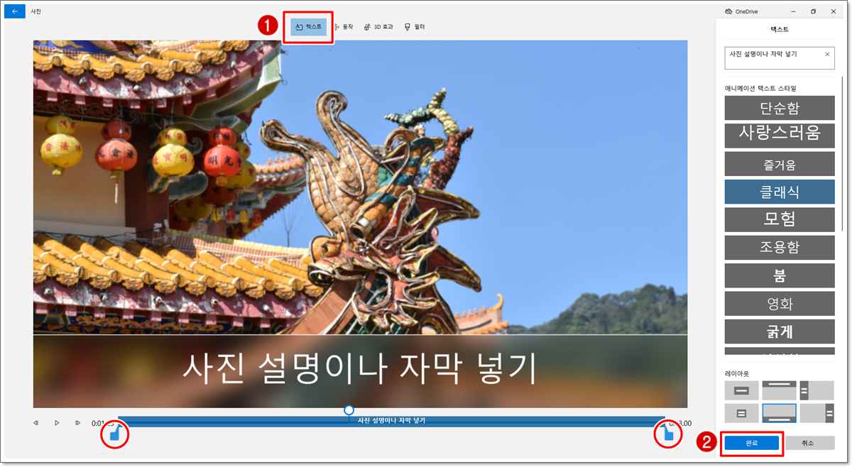 화면 가운데 위쪽에서 [텍스트] 탭을 클릭합니다. 해당 사진에 들어갈 내용을 입력한 다음 애니메이션 텍스트 스타일, 레이아웃을 선택하고 [완료]를 클릭합니다. 이때 사진 아래 재생 시간이 표시되는 부분의 양끝에 있는 조절바(○ 표시된 부분)를 드래그하면 텍스트가 보이는 시간을 조절할 수 있습니다. 텍스트를 입력하거나 3D 효과, 필터를 적용할 경우는