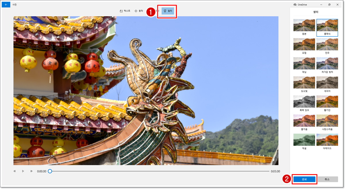 화면 가운데 위쪽에서 [필터] 탭을 클릭합니다. 해당 사진에 적용될 필터 효과를 선택하고 [완료]를 클릭합니다.