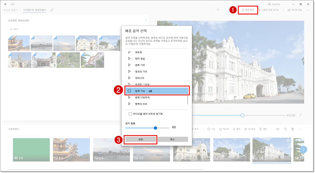 화면 오른쪽 위에서 [배경음악]을 클릭합니다. 배경 음악 선택 메뉴가 나타나면 해당 동영상에 적용할 배경 음악을 지정하고 [완료]를 클릭합니다. [비디오를 음악 비트와 동기화]를 선택할 경우에는 음악의 길이에 맞게 사진이 보이는 시간을 자동으로 조절해줍니다. 또한 배경 음악을 따로 준비한 경우에는 [사용자 지정 오디오] 메뉴를 이용하면 됩니다.