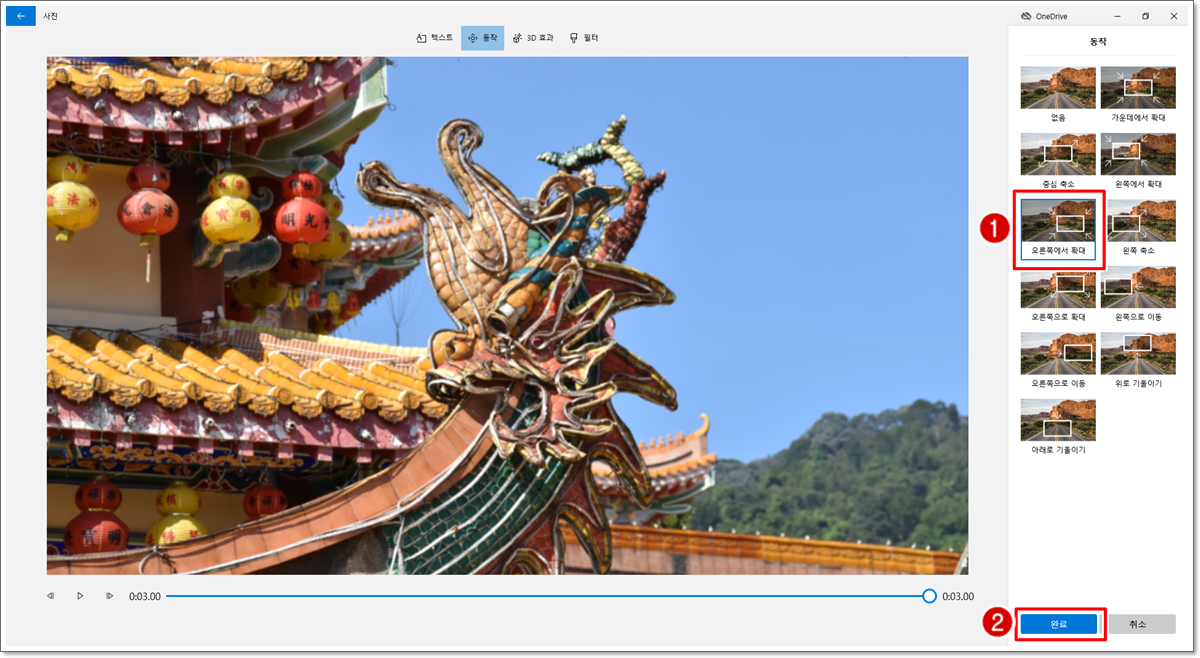 선택된 사진에 적용될 동작 효과를 지정하고 [완료]를 클릭합니다. 텍스트를 입력하거나 3D 효과, 필터를 적용할 경우는