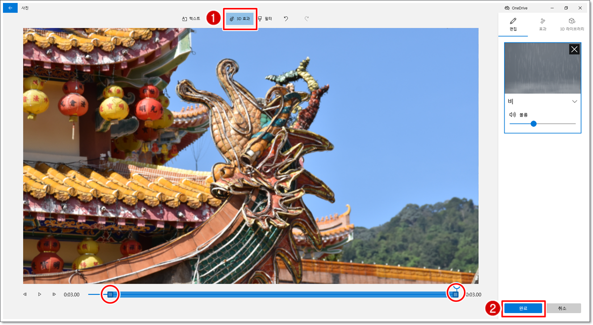화면 가운데 위쪽에서 [3D 효과] 탭을 클릭합니다. 해당 사진에 들어갈 3D 효과 등을 선택하고 [완료]를 클릭합니다. 이때 사진 아래 재생 시간이 표시되는 부분의 양끝에 있는 조절바(○ 표시된 부분)를 드래그하면 3D 효과가 보여지는 시간을 조절할 수 있습니다. 텍스트를 입력하거나 3D 효과, 필터를 적용할 경우는 [완료]를 클릭하지 않고, 사진 위 부분에 있는 해당 메뉴의 탭을 클릭하면 됩니다.