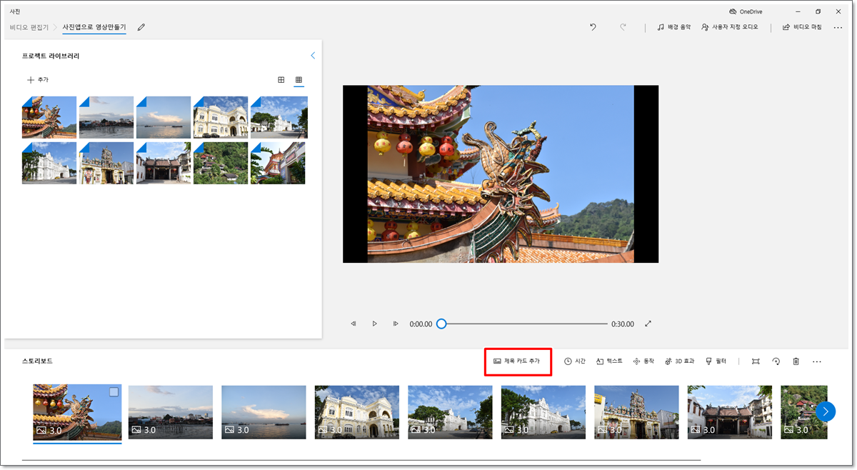 동영상 가장 앞부분에 들어갈 텍스트를 입력하기 위해 [제목 카드 추가]를 클릭합니다. 이때 스토리보드의 가장 왼쪽에 있는 사진이 선택되어 있어야 합니다. 다른 사진이 선택되어 있을 경우 그 사진 앞에 제목 카드가 추가됩니다. 제목 카드는 별도로 스토리보드에 추가되나, 첫 번째 사진을 선택하고 그 사진에도 제목 스타일의 텍스트 입력도 가능합니다.