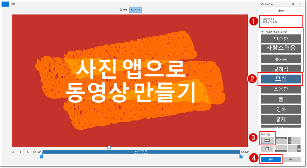 제목 텍스트를 입력한 다음 애니메이션 텍스트 스타일, 레이아웃을 지정합니다. 배경 색상을 바꾸지 않을 경우에는 [완료]를 클릭하면 됩니다.