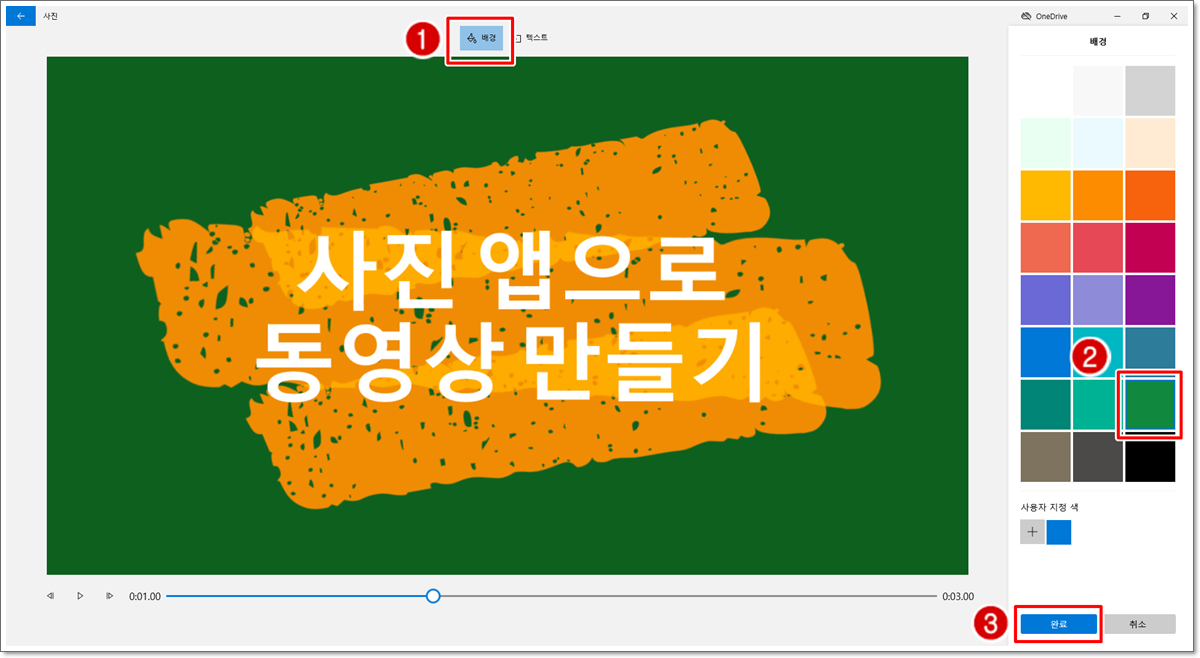 상단의 [배경] 탭을 클릭한 다음, 원하는 색상을 선택하고 [완료]를 클릭합니다.