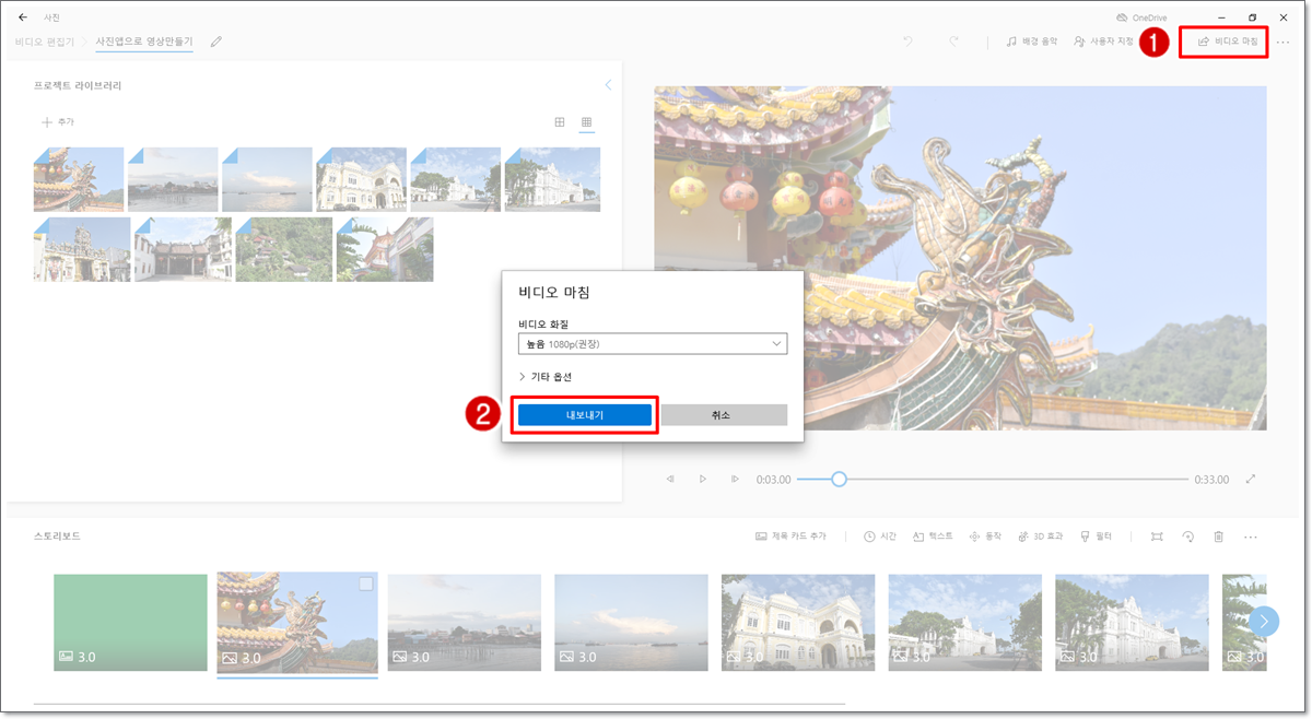 만들어질 비디오가 저장될 위치와 이름을 지정하고 [내보내기]를 클릭합니다.