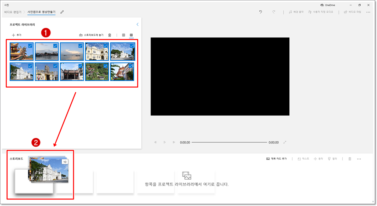 라이브러리에 있는 사진을 모두 선택한 다음 스토리보드로 끌어다 놓습니다.