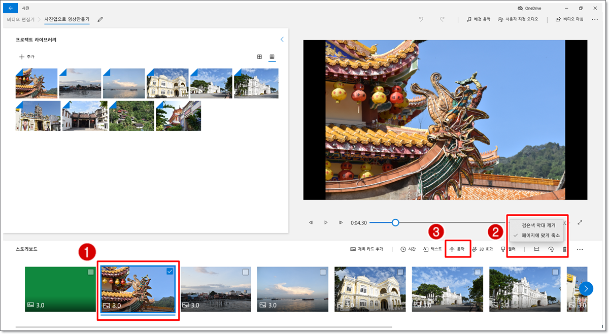 사진을 선택한 다음 [검은색 표시줄 제거 또는 표시] 메뉴를 클릭합니다. 사진 비율에 따라 검은색 막대가 나타날 경우 [ 검은색 표시줄 제거] 메뉴를 이용하면 됩니다. 검은색 표시줄은 사진의 상하 또는 좌우에 생기는 것으로 사진과 영상의 화면 비율 때문입니다. 예를 들어 사진과 영상의 화면 비율이 모두 16:9와 같이 같다면 검은색 표시줄은 생기지 않습니다. 이어 [동작]을 클릭합니다.