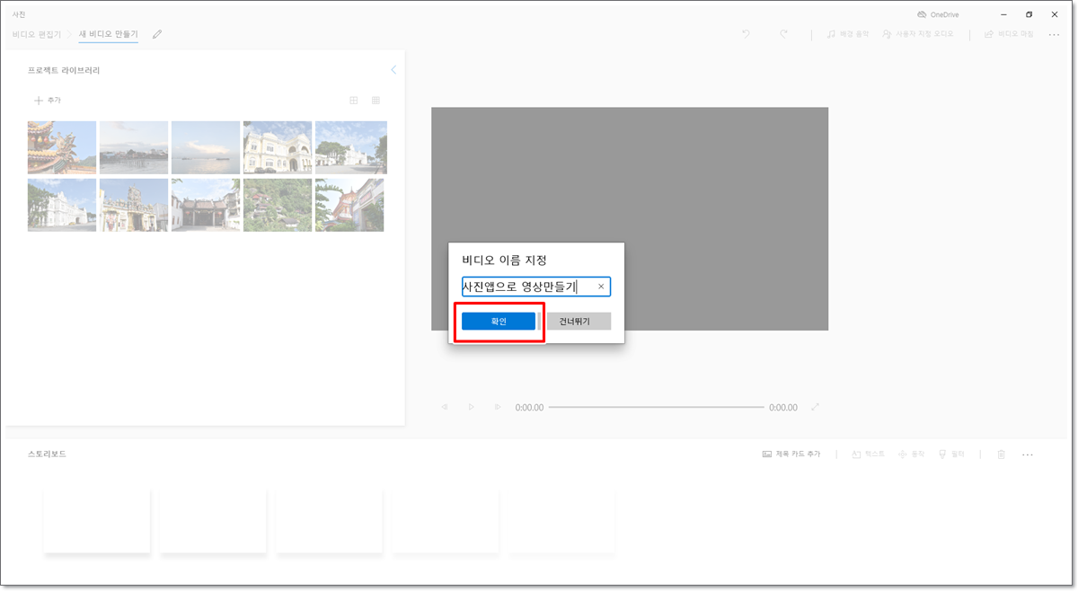 선택한 사진들로 만들어질 슬라이드쇼 비디오의 이름을 지정하고 [확인]을 클릭합니다.
