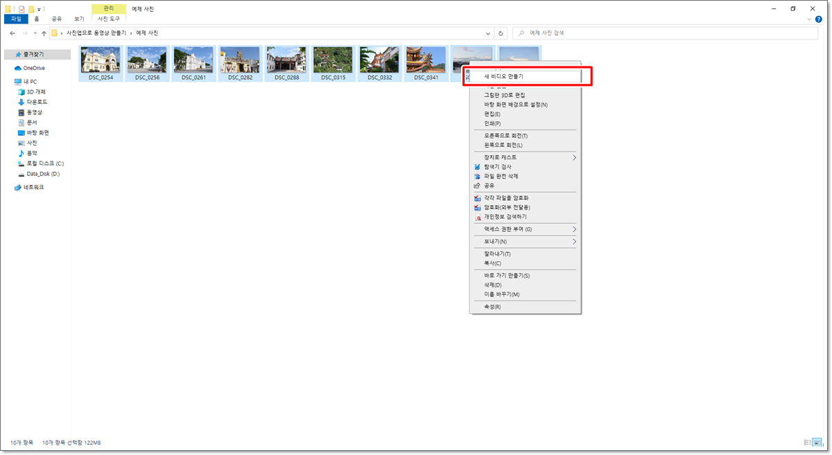 폴더에 모아 놓은 사진들을 모두 선택한 다음, 마우스 오른쪽 단추를 누르면 나오는 바로가기 메뉴 중에서 [새 비디오만들기]를 클릭합니다.